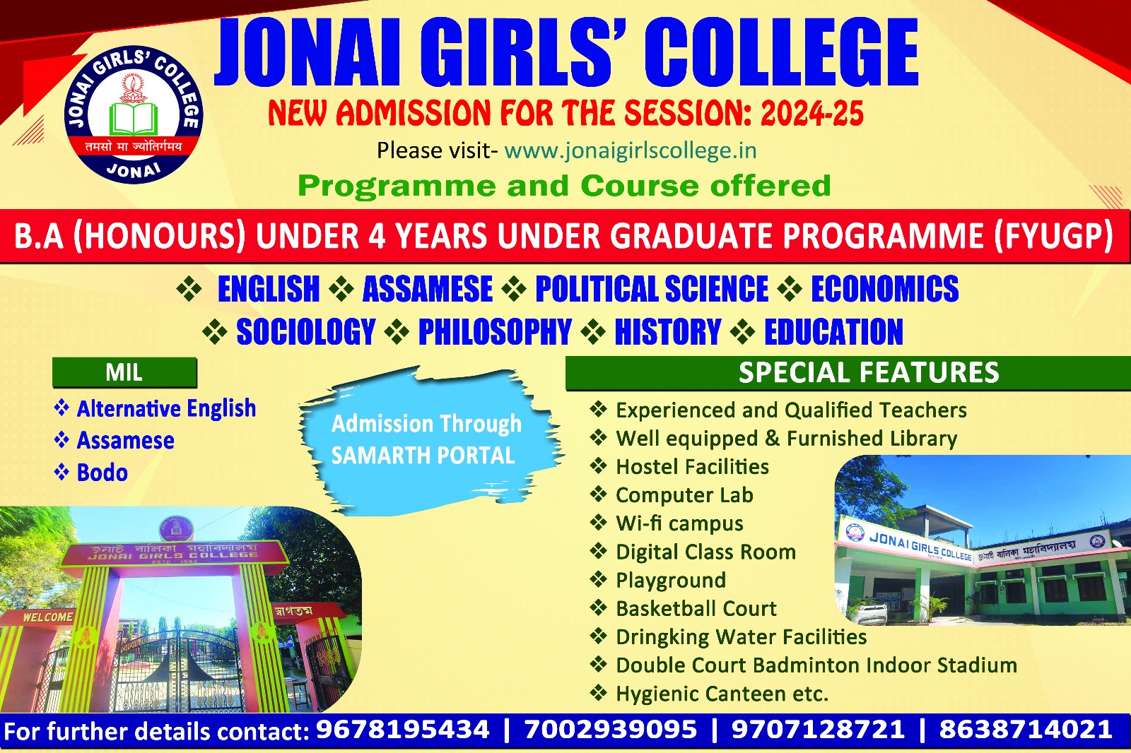 Jonai Girls' College is situated in the vicinity of Jonai township area established in the year 1994 with the cherished goal of spreading and imparting higher education to backward women section of Jonai Sub-Division, Assam and abutting areas of Arunachal Pradesh. Since the day of its inception, the college has been relentlessly working to attain its cherished goal of spreading the light of knowledge to hitherto uncontested weaker section of this area. Jonai Girls' College is the outcome of concerted efforts, sacrifice and dedication of the local people, teaching and non-teaching staff of the college, the far ...